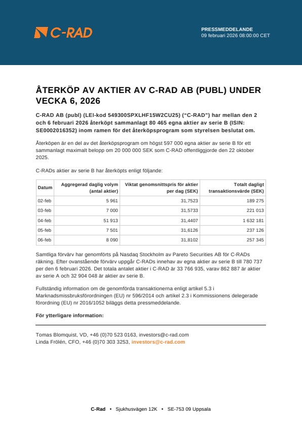 Samtliga förvärv har genomförts på Nasdaq Stockholm av Pareto Securities AB för C-RADs räkning. Efter ovanstående förvärv uppgår C-RADs innehav av egna aktier av serie B till 780 737 per den 6 februari 2026. Det totala antalet aktier i C-RAD är 33 766 935, varav 862 887 är aktier av serie A och 32 904 048 är aktier av serie B.