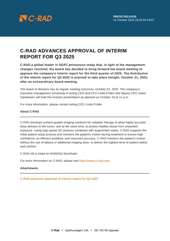 C-RAD,a global leader in SGRT,announces today that, in light of the management changes resolved, the board has decided to bring forward the board meeting to approve the company's interim report for the third quarter of 2025. The distribution of the interim report for Q3 2025 is planned to take place tonight, October 21, 2025, after an extraordinary board meeting.