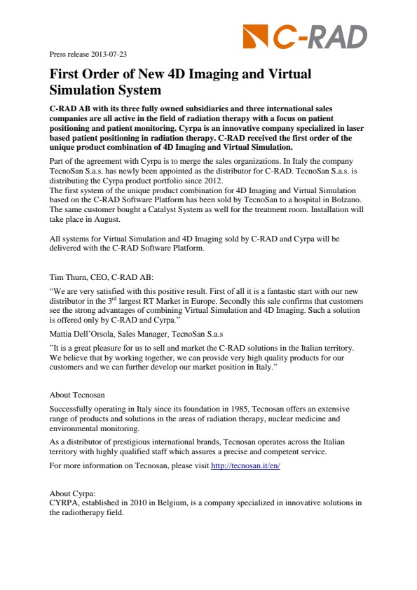 “We are very satisfied with this positive result. First of all it is a fantastic start with our new distributor in the 3rd largest RT Market in Europe. Secondly this sale confirms that customers see the strong advantages of combining Virtual Simulation and 4D Imaging. Such a solution is offered only by C-RAD and Cyrpa.”