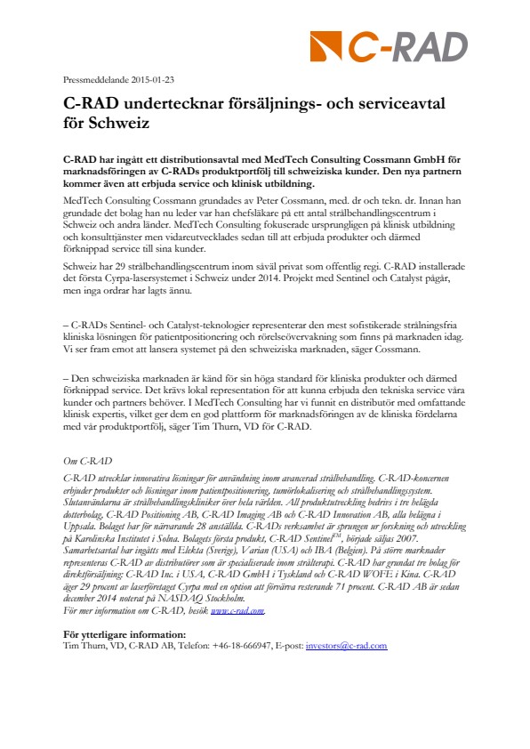 – Den schweiziska marknaden är känd för sin höga standard för kliniska produkter och därmed förknippad service. Det krävs lokal representation för att kunna erbjuda den tekniska service våra kunder och partners behöver. I MedTech Consulting har vi funnit en distributör med omfattande klinisk expertis, vilket ger dem en god plattform för marknadsföringen av de kliniska fördelarna med vår produktportfölj, säger Tim Thurn, VD för C-RAD.