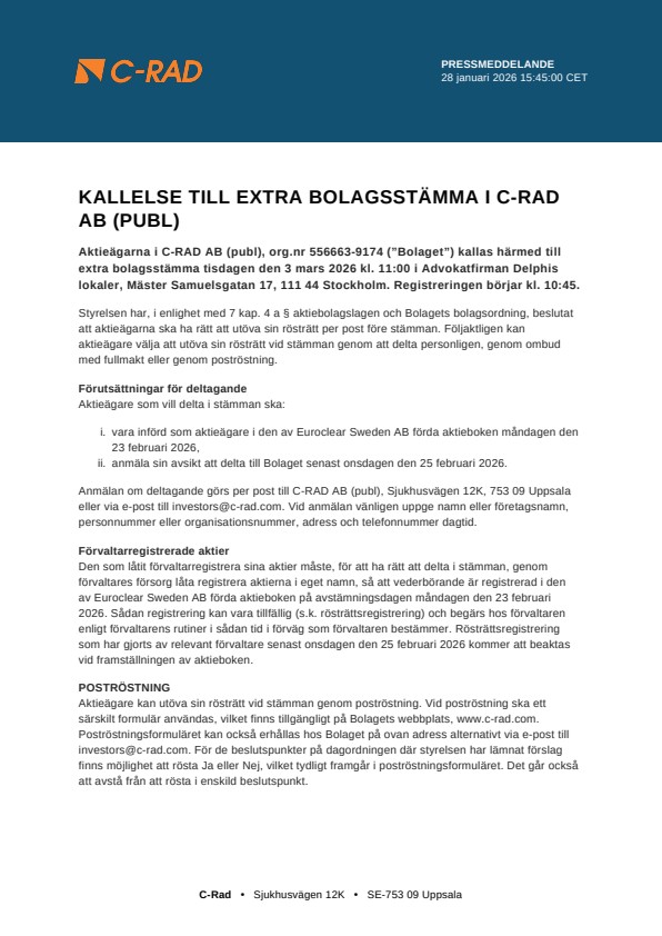Aktieägarna i C-RAD AB (publ), org.nr 556663-9174 (”Bolaget”) kallas härmed till extra bolagsstämma tisdagen den 3 mars 2026 kl. 11:00 i Advokatfirman Delphis lokaler, Mäster Samuelsgatan 17, 111 44 Stockholm. Registreringen börjar kl. 10:45.
