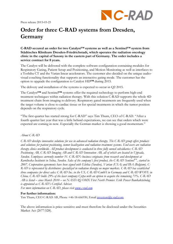 Tim Thurn, CEO C-RAD AB, Phone +46-18-666930, Email investors@c-rad.com